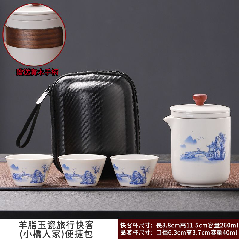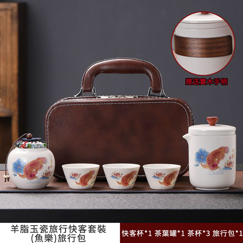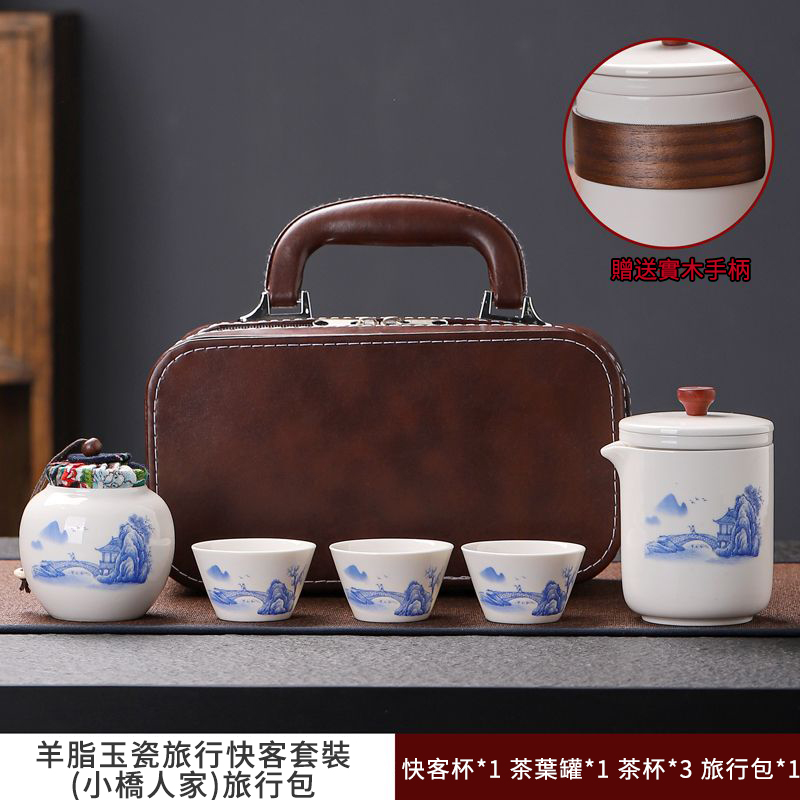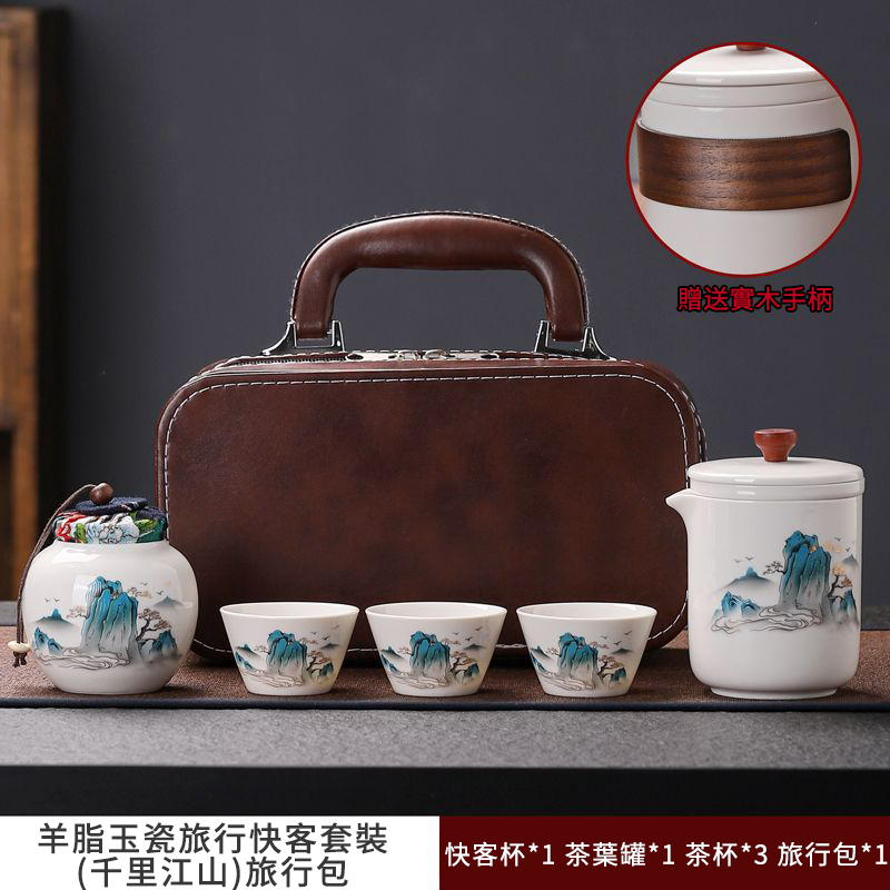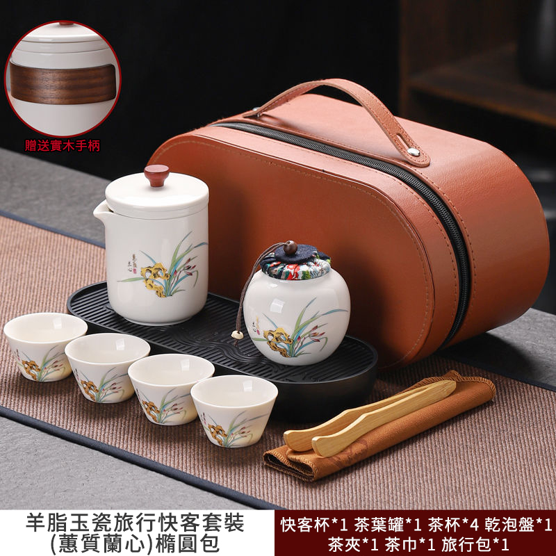 這套質樸淡雅的茶具套裝採用皮包式旅行包進行收納,整體小巧精緻,手提方便。