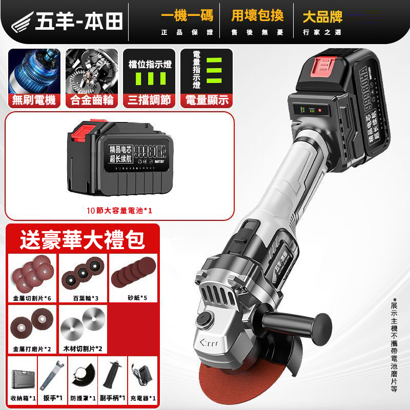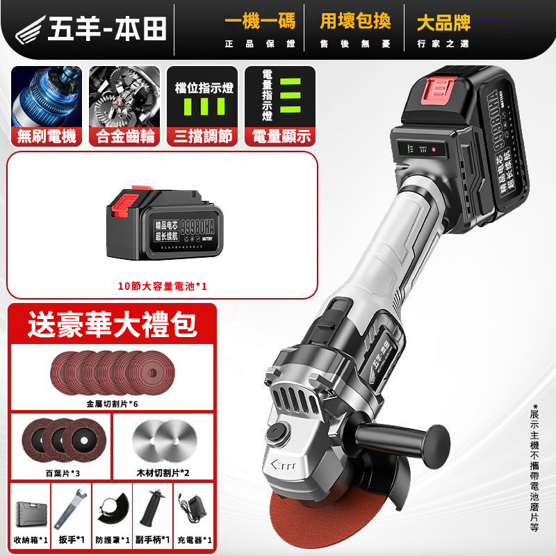 15分鐘前【日本-HONDA】升級帶電顯进口無刷鋰電角磨機 打磨 拋光 切割 一機多用 純銅電機 高效散熱 配置防護護罩 保護你的安全作業 保固三年 損壞包退換 限量出清 - 69800豪華電顯款【1電池】+塑盒